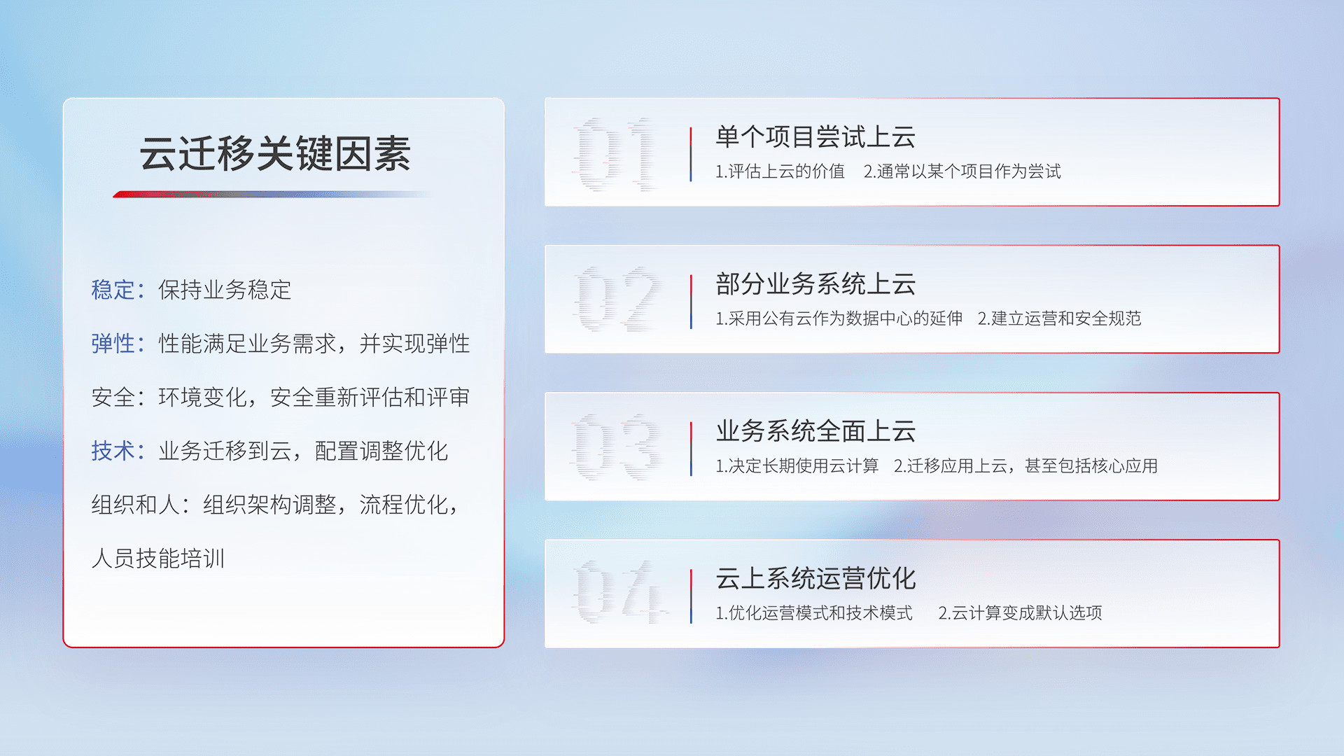 结合实际业务,,,,从规划设计、、云平台选型、、云原生改造、、、、数据迁移、、、、集成交付,,,,迁移全过程为客户识别最佳上云路径,,做好风险识别管理,,设计网络架构、、、身份权限、、、安全审计合规、、、、操作审计、、、日志审计、、、、监控告警策略、、、多站点容灾设计等,,,对云上基础设施进行整体规划,,提升IT治理水平,,以满足弹性、、高可用、、、、高性能的需求。。。